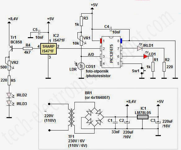 As I mentioned before, this is an add-on or a hack to my Dual Channel IR Remote Control (IR Remote Switch) project and after reading the description of that project it is clear that for it's operation IR remote controller is required. No problem here since we can emulate RC5 remote controller with PIC and one IR LED. With this PIC we need to send IR codes for ON and SLEEP functions on every obstacle detection so that the IR Remote Switch turns the lights ON and sets them to SLEEP - meaning that they will turn off in about 1-2 minutes. That's about all that this device does, besides measuring ambient light level and it also has a button to send 5 IR codes for programming the IR remote switch.